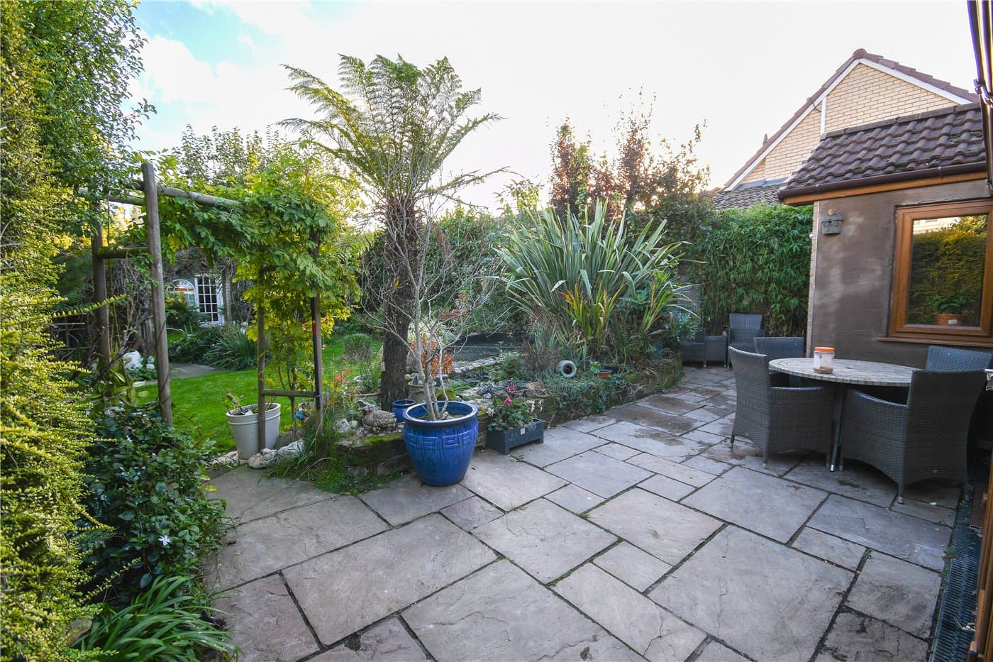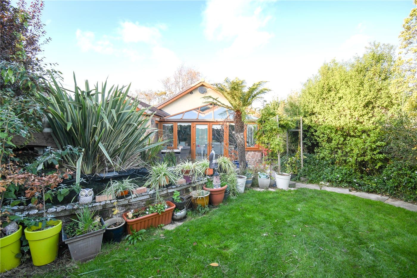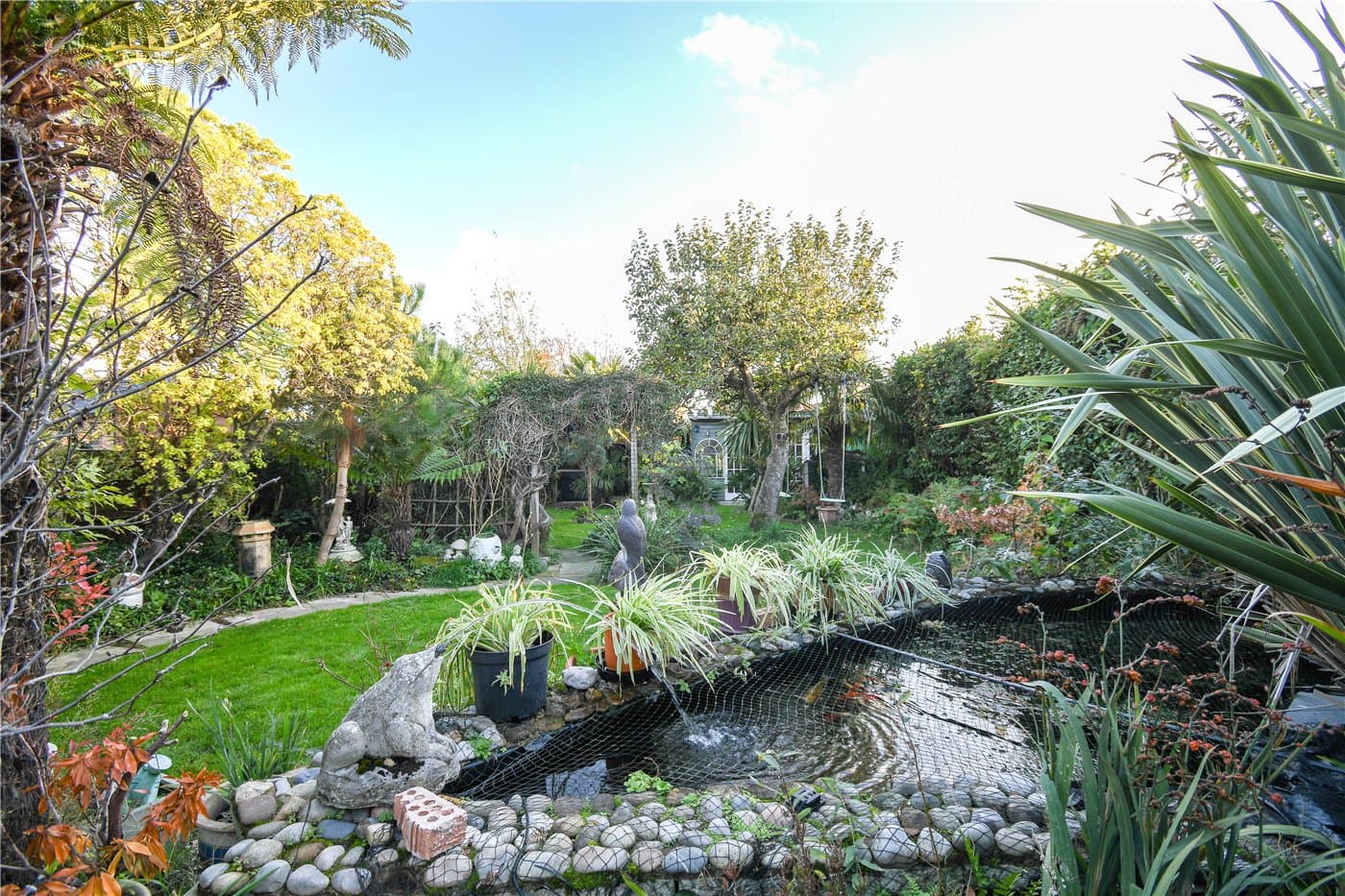 Landscaped south facing rear garden with mature planting & pond