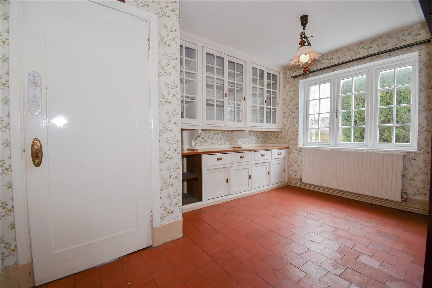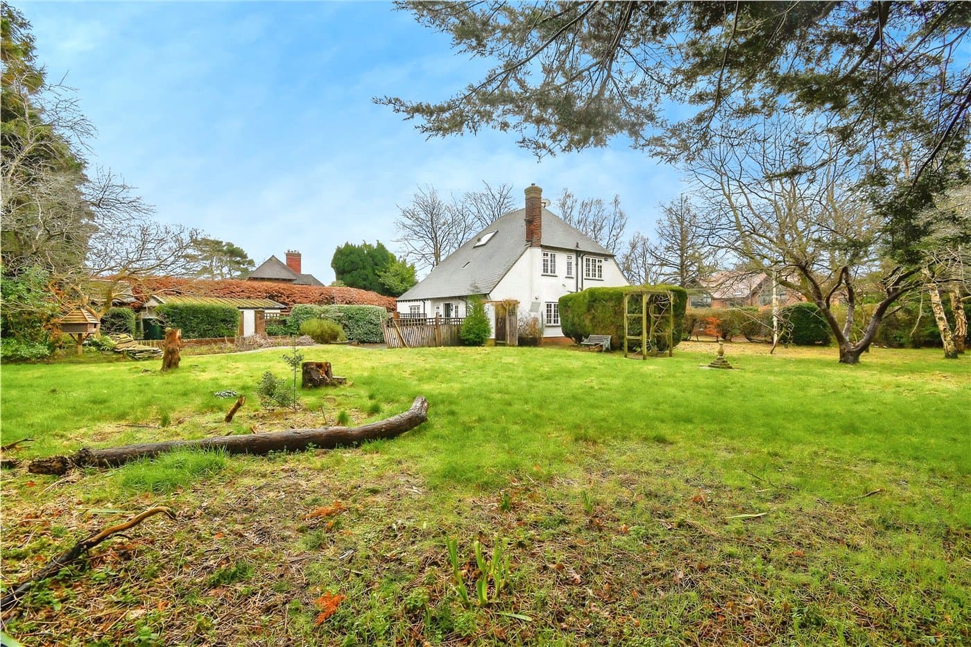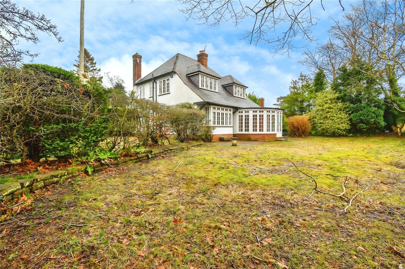 Three bedroom detached house in a prestigious location offering a fantastic renovation opportunity. Set on an expansive private plot, it features spacious rooms, a large kitchen, utility room, conservatory, master ensuite, mature gardens, detached garage, and ample driveway parking.