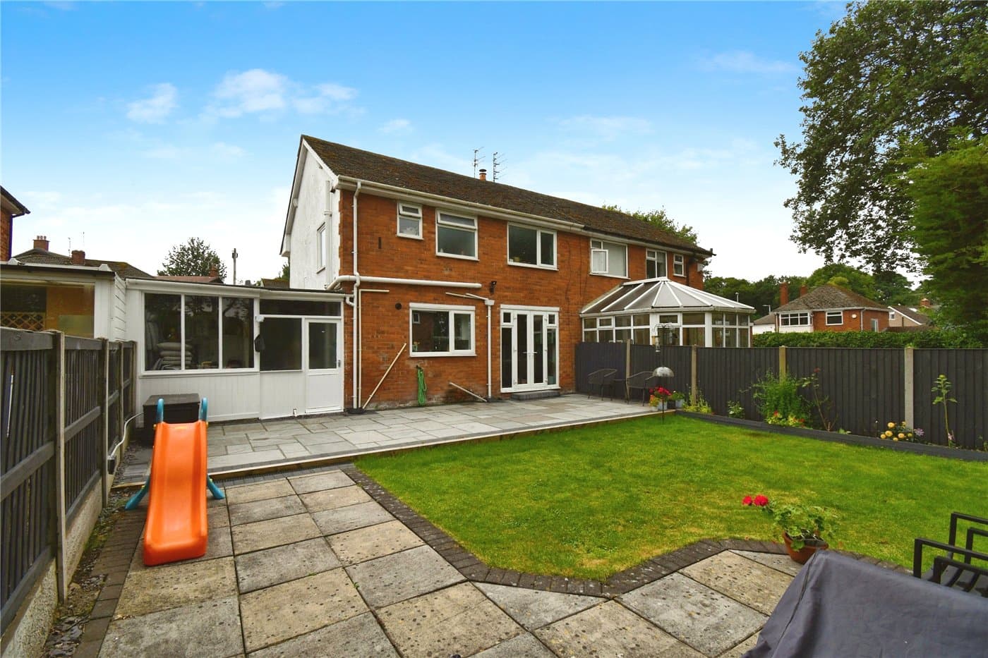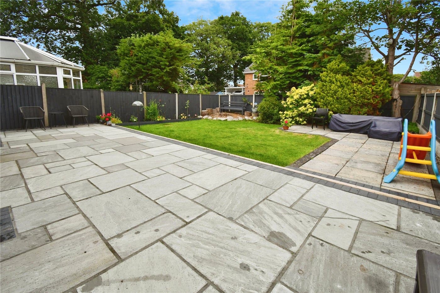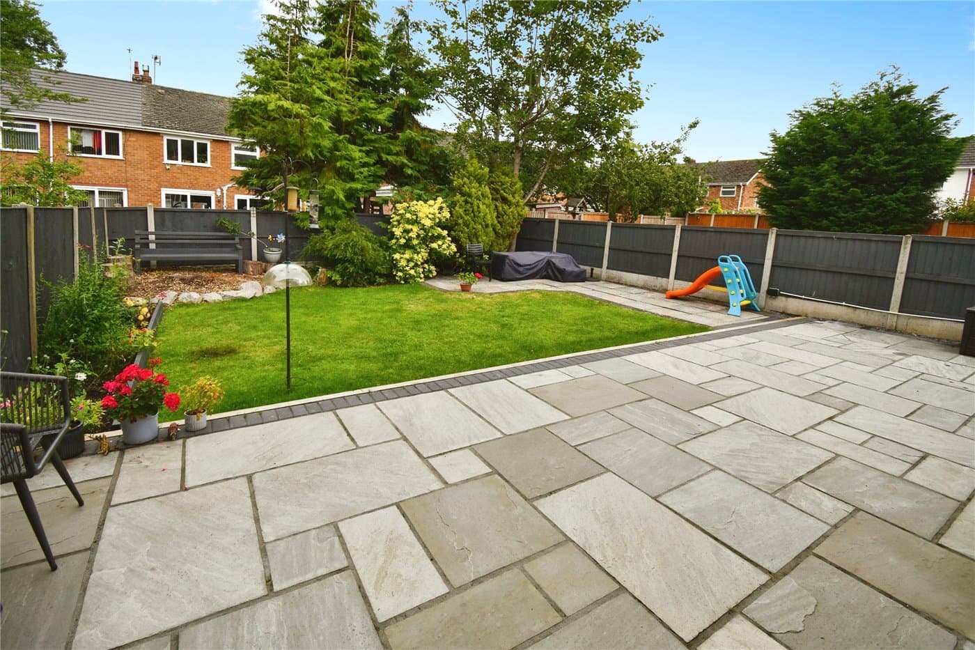 Large sunny garden with newly laid patio