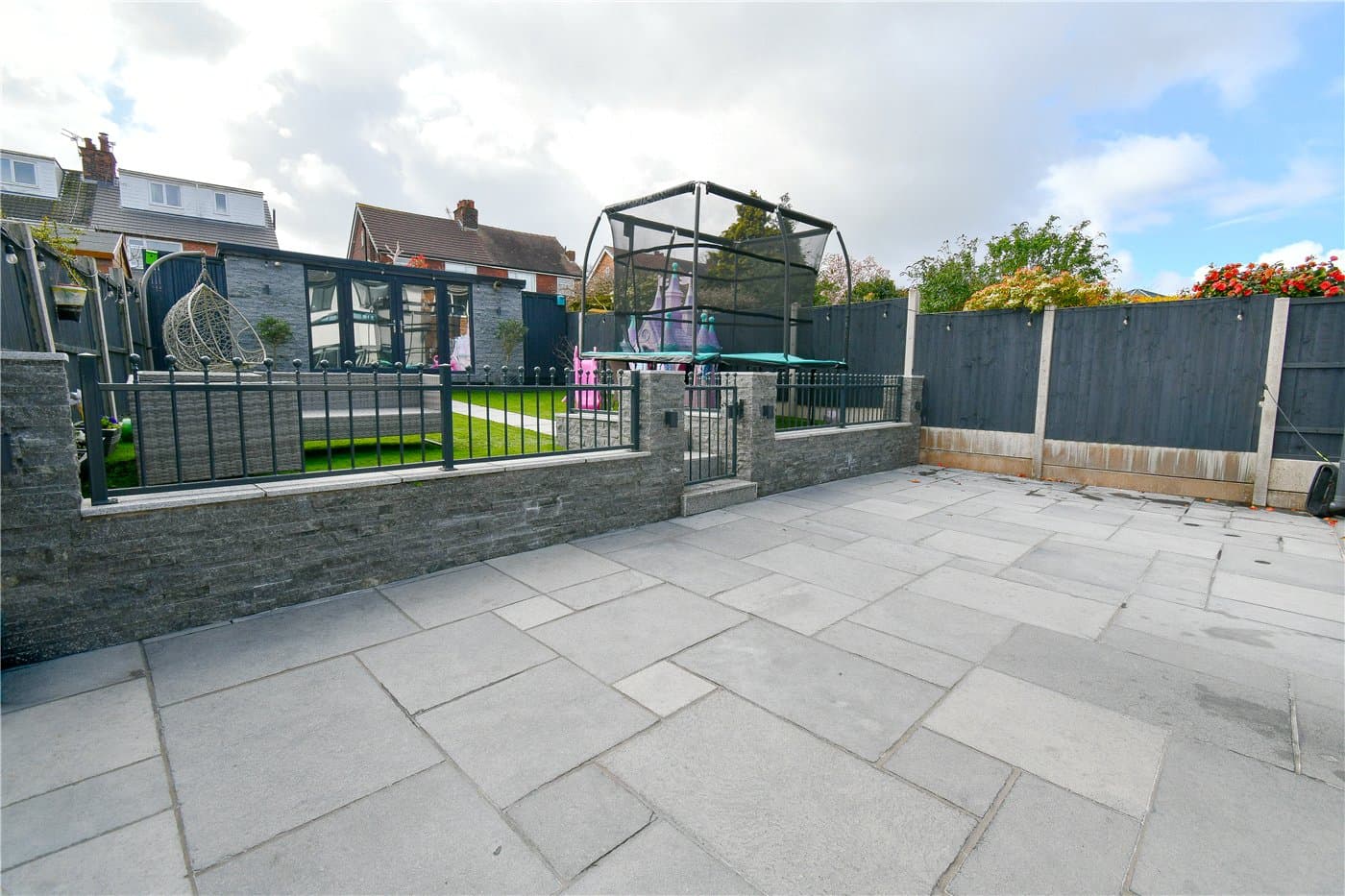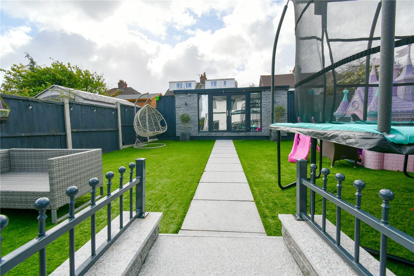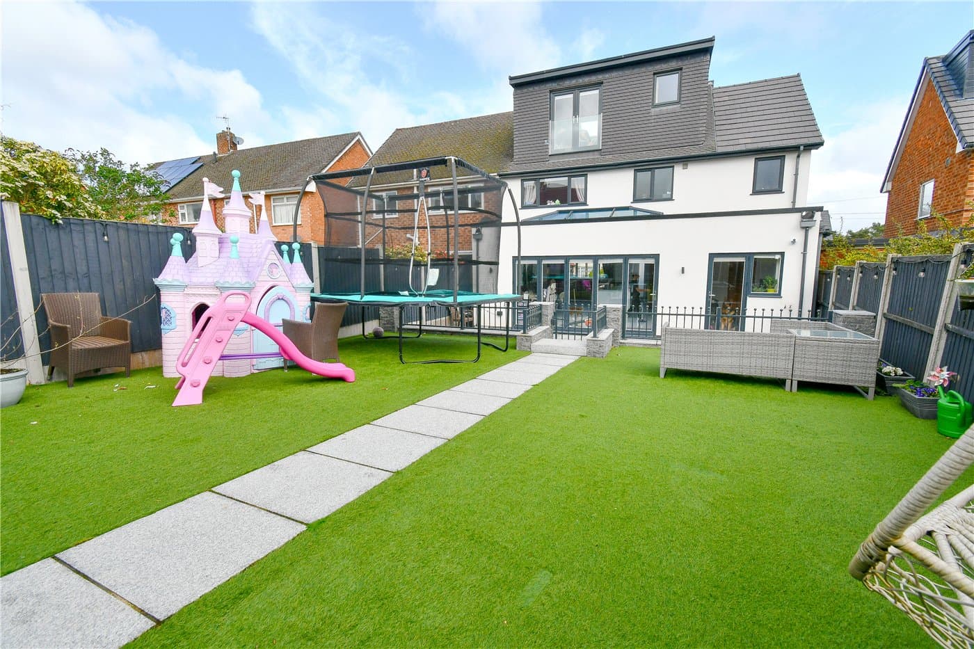 Ample off-road parking and a landscaped rear garden with artificial lawn, patio, and powered summer house.