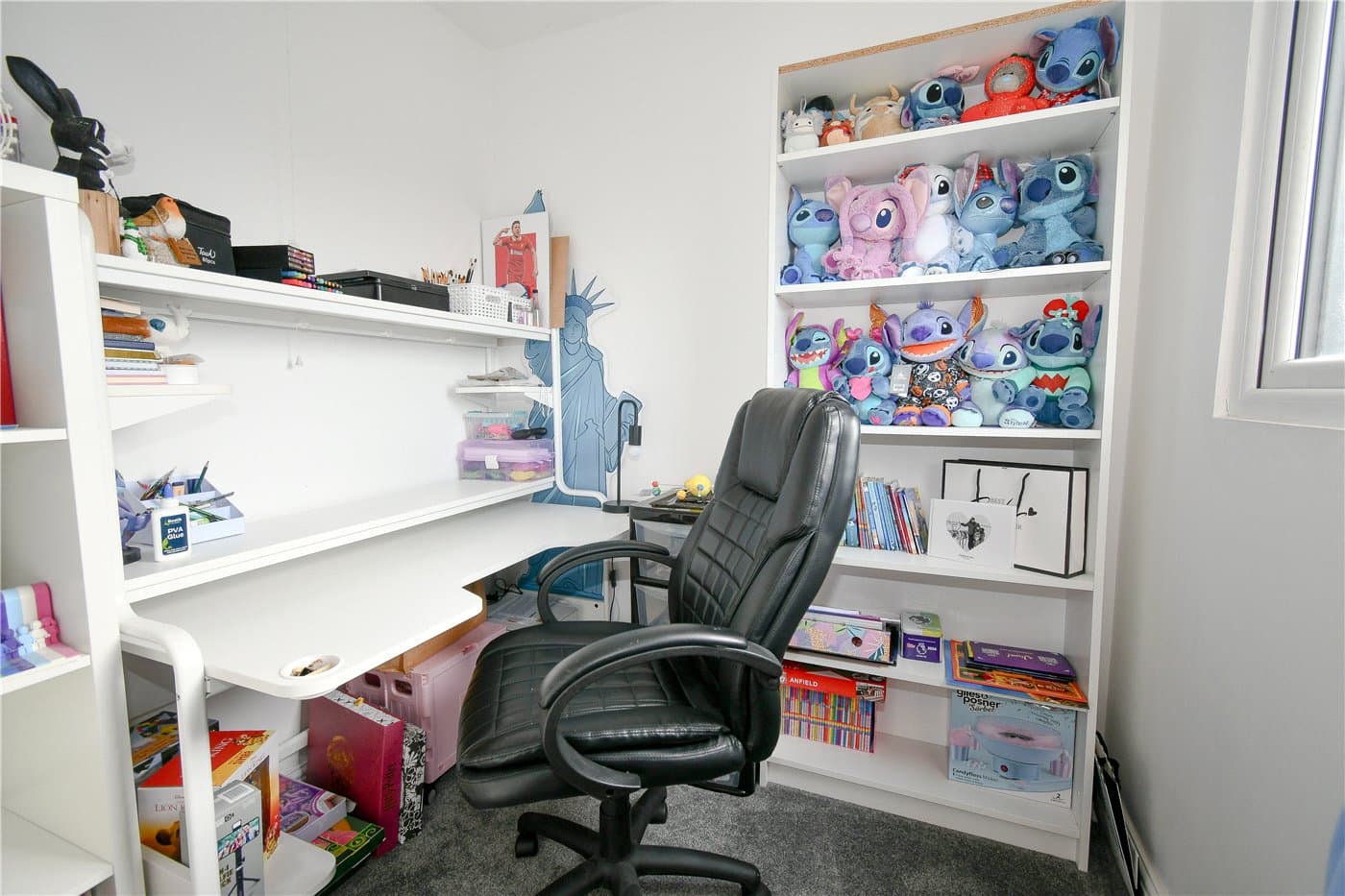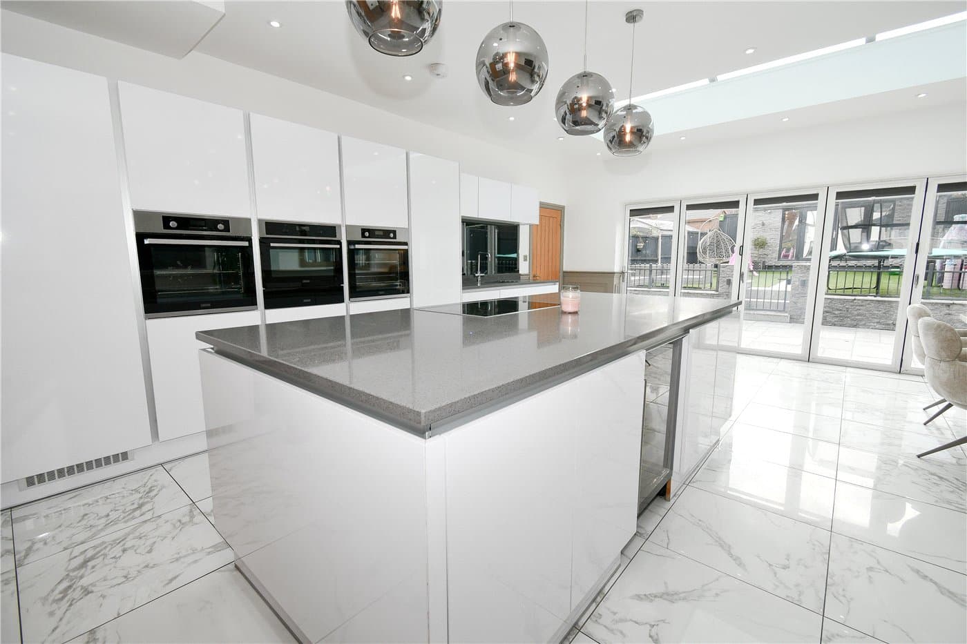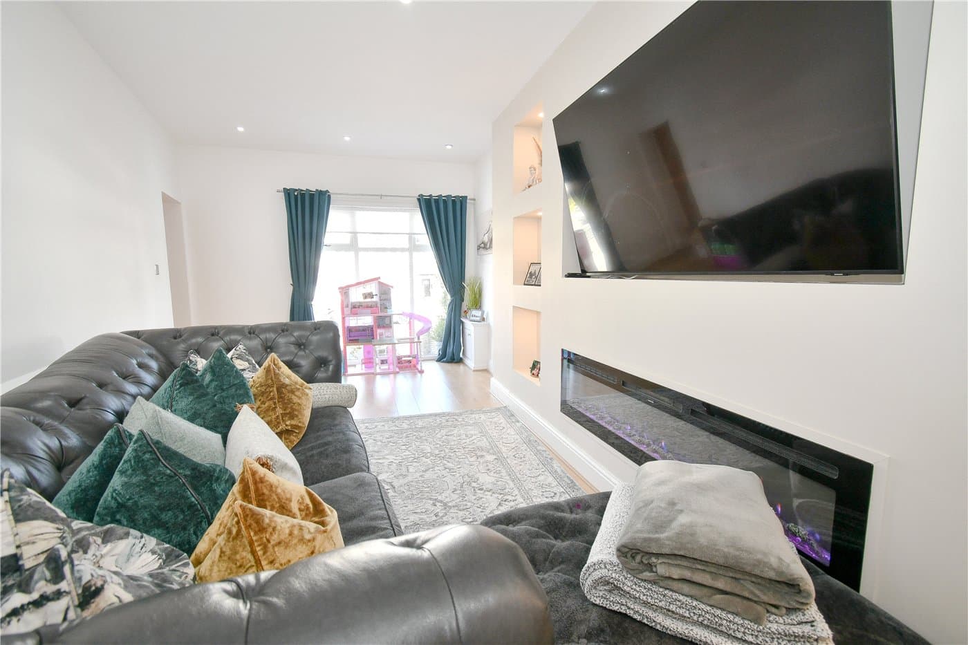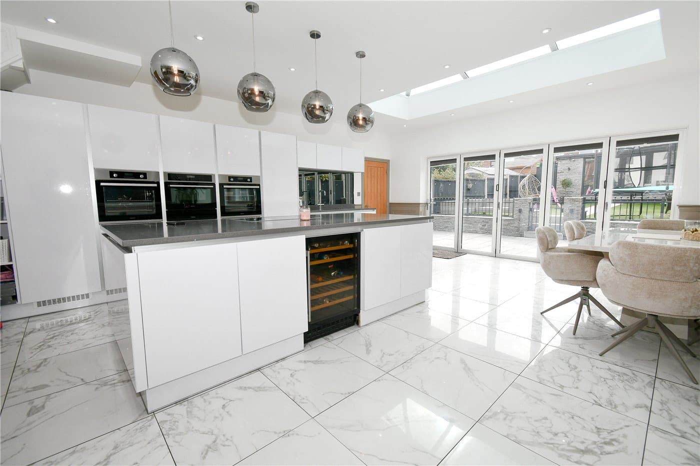 Ample off-road parking and a landscaped rear garden with artificial lawn, patio, and powered summer house.