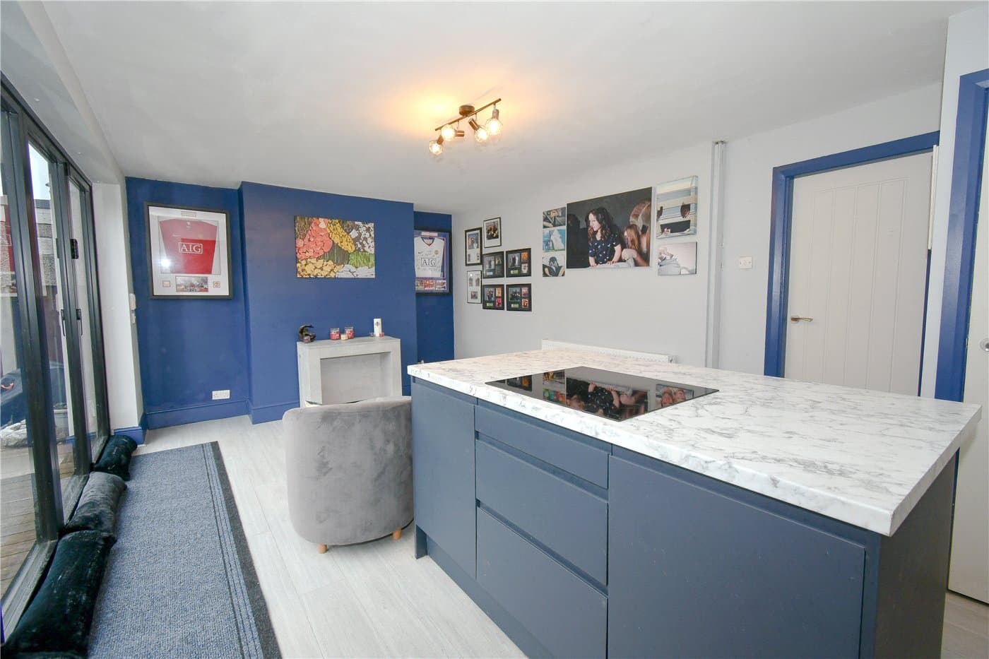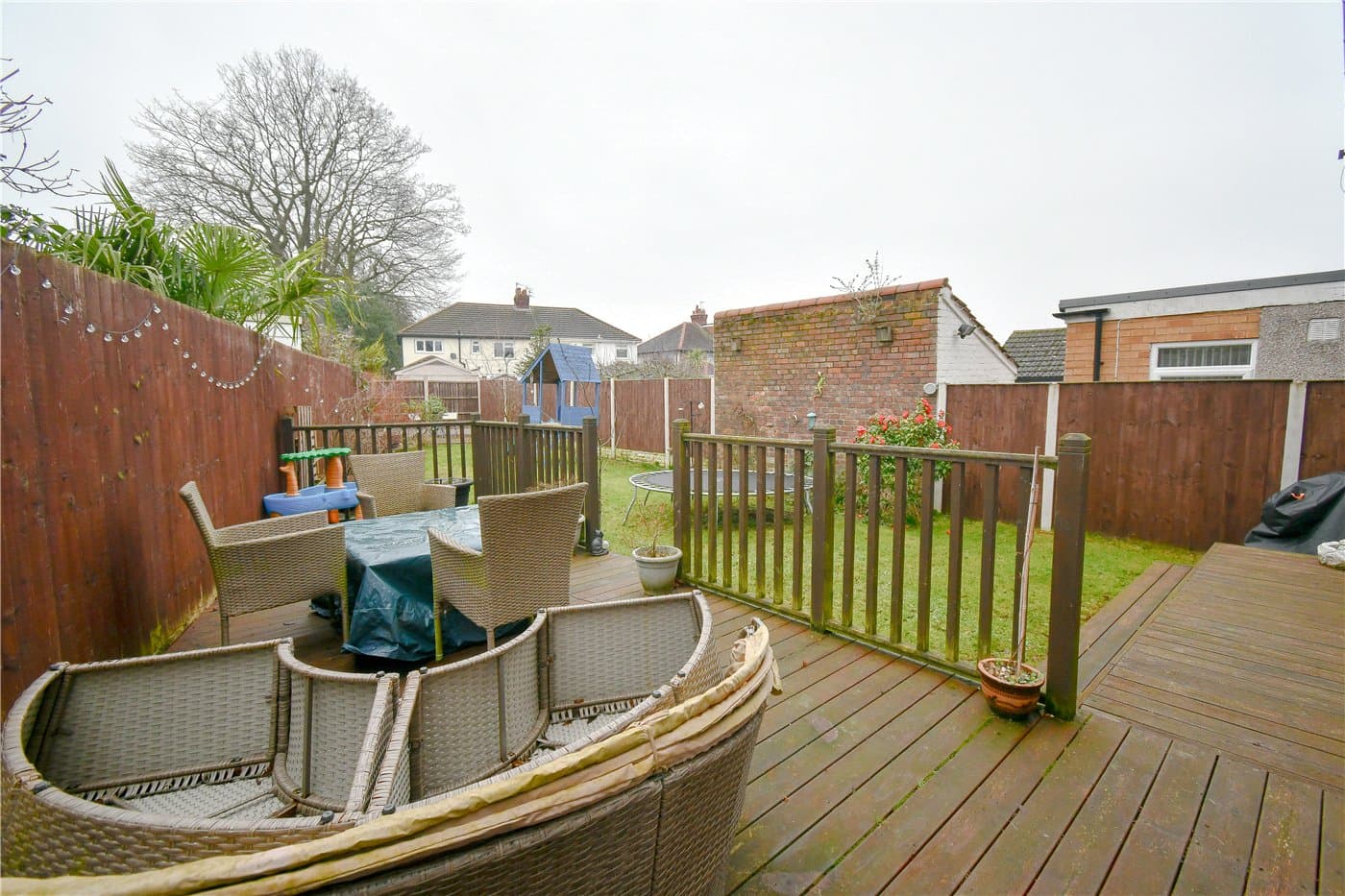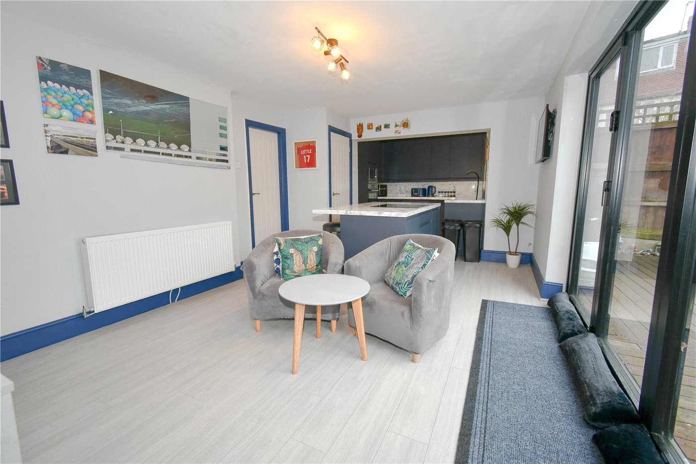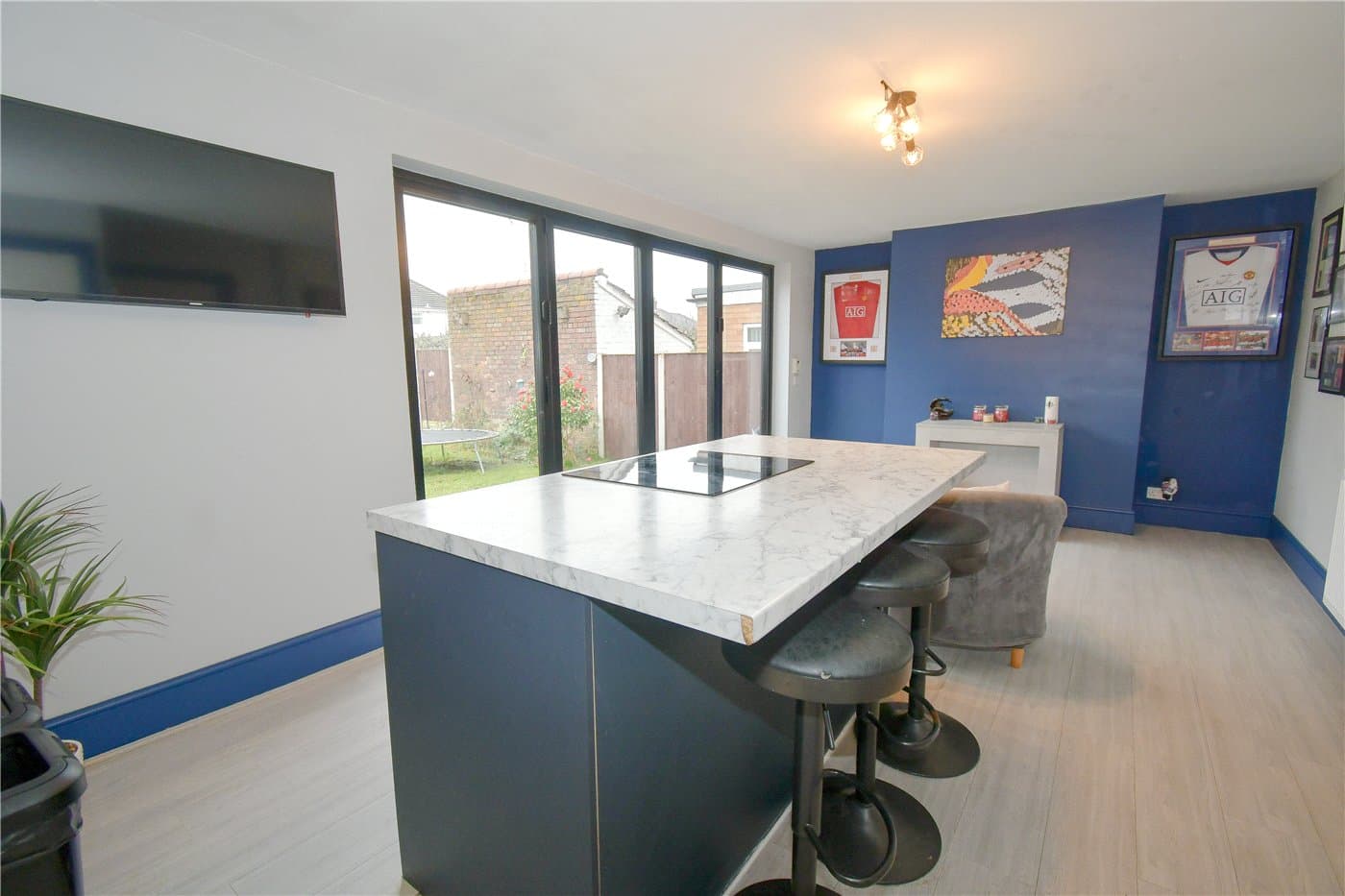 An extended detached home at the end of the cul-de-sac, offering two reception rooms, an open-plan kitchen with island and bi-fold doors, three bedrooms and a family bathroom, plus driveway parking and a lawned rear garden with decked patio areas, close to amenities, transport links and schools.